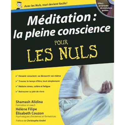 Etre pleinement conscient à soi pour vivre mieux !Technique incisive de méditation qui fait appel aux techniques de présence à soi, la méditation pleine conscience est reconnue mondialement comme un outil puissant pour venir à bout des pensées et des émotions négatives. Elle permet de recentrer son esprit sur les idées positives et ainsi d'atteindre la sérénité tout en ayant des effets bénéfiques sur la santé, démontrés par de nombreuses études scientifiques concordantes. Écrit par des spécialistes de la méditation, ce guide pratique vous propose de faire battre en retrait la dépression, la mauvaise estime de soi, les douleurs chroniques et l'insomnie ! Comment ? En apprenant à appliquer des technique de self-control comme des postures corporelles particulières, des exercices de respirations et des rituels sources de ressourcement. Il aborde aussi la question des attitudes à bannir et à adopter pour que son corps et son esprit se rassérènent. Le CD accompagnant le livre est là pour vous permettre d'aller plus loin en proposant des exercices de méditation. La Méditation pleine conscience pour les Nuls, un guide simple à utiliser au quotidien pour mieux vivre, en accord avec soi ! Avec une préface de Christophe André. Broché=384 pages. Editeur =First (25 avril 2013). Collection =Pour Les Nuls. Langue =Français. ISBN-10=2754044639. ISBN-13=978-2754044639. Dimensions du produit=19,2 x 2,6 x 23,2 cm. Moyenne des commentaires client =3.6 étoiles sur 5 10 commentaires client. Classement des meilleures ventes d'AmazonSoins du corpsMéditationBouddhisme=114.984 en Livres (Voir les 100 premiers en Livres) .zg_hrsr { margin: 0; padding: 0; list-style-type: none; } .zg_hrsr_item { margin: 0 0 0 10px; } .zg_hrsr_rank { display: inline-block; width: 80px; text-align: right; } n°298 dans Livres > Santé, Forme et Diététique > Beauté, forme et détente > n°475 dans Livres > Famille, Santé et Bien-être > Développement personnel > New Age et spiritualité > n°739 dans Livres > Religions et Spiritualités >.Les enrichissements audio ne fonctionne que sur le hardware récent, bien que réputé compatible à l'achat.Bref, c'est juste un livre, sauf si vous avez les dernièrers versions de kindle.Ne fonctionne pas non plus sur smartphone.Ca manque un peu de sérieux tout ça, pratiquer la méditation ça me semble aussi pénétrer dans un monde de gentils fantaisistes qui pratiquent avant tout l'àpeuprisme...Acceptons ce qui est.... J'avais deja lu plusieurs ouvrages sur la meditation et je pratique le yoga depuis plus de 40 ans. L'ouvrage d'Helene Filipe et al correspond tout a fait a mon attente par son aspect pratique. C'est un outil ideal pour des neophites d'aborder la mindfulness avec des effets benefiques a court terme. Les meditations guidees audio du CD sont tres agreables a suivre.Felicitations aux auteursGuyP.S.: c'est une tres bonne initiative d'avoir publie ce livre en francais.. mais que vous avez besoin d'une vue globale pour vous projeter dans l'univers de la méditation ce livre est pour vous! Il accompagne le lecteur sur le chemin de la compréhension et ne vous lache la main que quand vous avez toutes les clés.J'ai adoré!. J'ai aimé le livre, mais croyant pouvoir exploiter les enrichissements audio, on m'a expliqué qu'il me fallait manger des pommes pour y avoir acces... limite tromperie.... La pleine conscience m'intéresse et je l'ai rencontrée dans d'autres domaines. Cet ouvrage-ci est détaillé et progressif, fidèle à la collection "pour les nuls" qui nous habitue à la qualité. . Il s'adresse à tous, débutants ou confirmés. L'ouvrage est bourré de petites astuces et le CD permet une pratique directe qui nous éloigne pertinemment du plan livresque pur. Par contre, s'il était parfois un tout petit plus synthétique, ce serait parfait sur un plan directement quotidien et pragmatique..